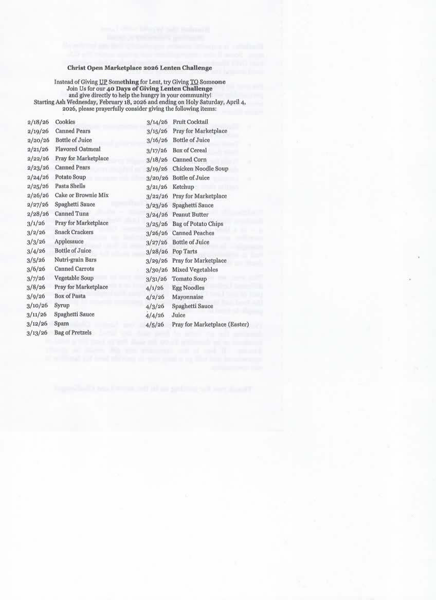 This year, we would like to encourage you to consider a slightly different Lenten sacrifice by giving food or a monetary donation as part of our Lent Challenge. Christ Open Marketplace depends on the food and monetary donations of generous donors to provide to people in need in our valley.